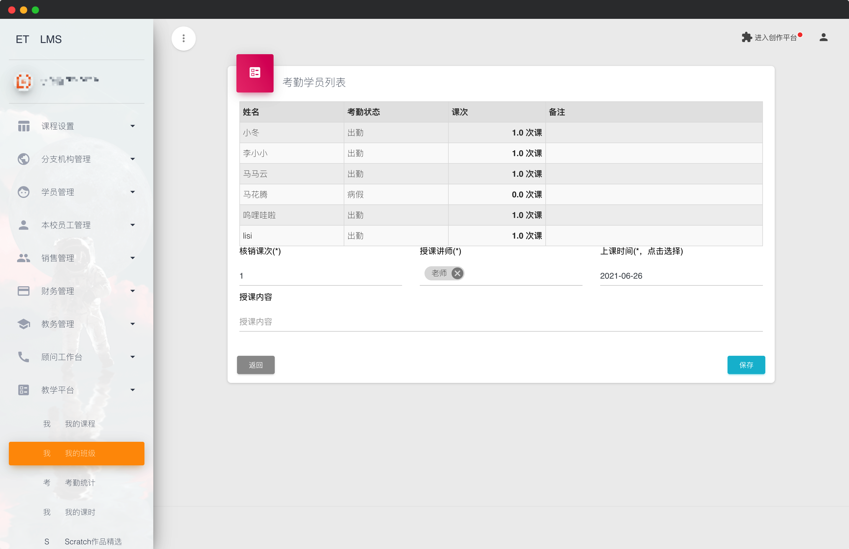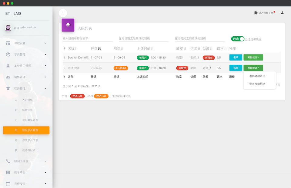 对应班级学生转、退、插班,老师和学生考勤管理等